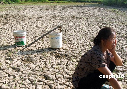 7月8日,一村民在为生活水源发愁。湖南邵阳县连日高温无雨,地处高旱山区的南山村遭受旱情肆虐,全村小溪断流,30多口山塘见底,200余亩农田开裂,100多村民饮水发生困难。据了解,全县高旱山区出现了不同程度的旱情。中新社发 李爱民 摄