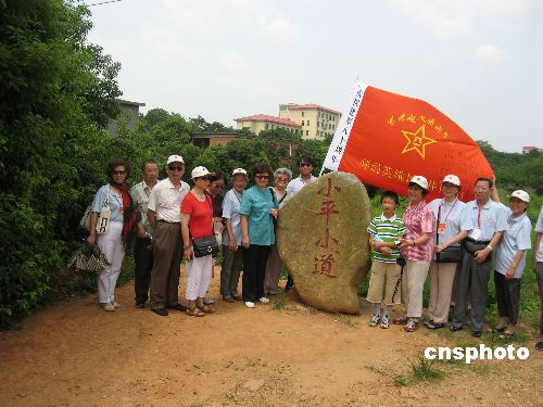 7月9日,江西南昌起义将帅的子女们在“小平小道”前合影留念。据悉,为纪念中国人民解放军建军80周年,由中国新闻社主办,八一南昌起义将帅的十一位后代们来到江西南昌,参加“重返英雄城 重上井冈山”活动。背景资料:“小平小道”位于江西省新建县望城岗,1969年冬天,一场“文化大革命”使65岁的邓小平被流放到这个小镇,成为一名拖拉机修配厂的工人。中新社发 吴庆才 摄