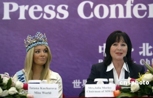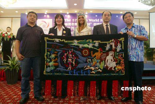 七月十二日,“三亚美丽使者奥运助威团”授旗仪式暨2007第五十七届世界小姐总决赛新闻发布会在北京举行。世界小姐机构主席莫莉夫人等出席会议。会议宣布,世界小姐机构成为2008年北京奥运助威团首个外国成员。据介绍,世界小姐以“三亚美丽使者”和“世界和平使者”的双重身份被破格吸收为北京奥运宣传助威团团员,她们将作为中国境内奥运火炬首传城市——三亚的特别代表,在世界各地推广奥林匹克精神,为2008年北京奥运会喝彩。中新社发 任海霞 摄