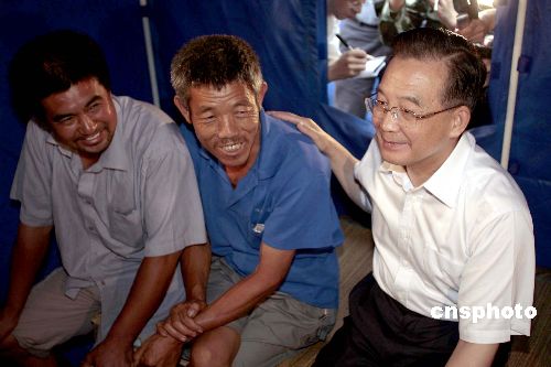七月十三日,国务院总理温家宝来到安徽视察淮河汛情,并探望了受灾民众。图为温家宝在安置点亲切询问避水群众的医疗及饮水情况。中新社发 盛佳鹏 摄