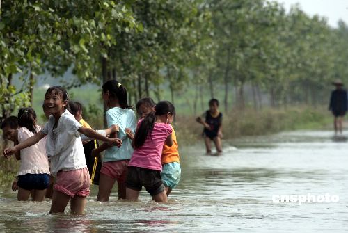 七月十五日,在安徽颍上县一条被水淹没的路上,孩子们玩得不亦乐乎。自十一日行蓄洪,安徽颍上县受灾严重,不少道路被淹。中新社发 盛佳鹏 摄
