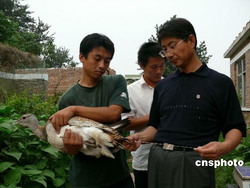 | 2007年7月15日凌晨3点,历经22小时长途跋涉将近1500余公里的行程,河北沧州野生动物保护中心负责人沧州师专生物系副教授孟德荣和保护鸟类志愿者们终于把半年前受伤康复的国家一级保护鸟类大鸨送到三千里外的栖息地内蒙古兴安盟图牧吉国家级自然保护区进行放飞。内蒙古兴安盟图牧吉国家级自然保护区管理局热情的迎接放飞组成员的到来,并组织了大鸨和丹顶鹤的放飞仪式。此次两地携手放飞成功,预示着鸟类异地保护新篇章的一个新的开始,谱写了广大动物保护者同鸟类人鸟和谐新的篇章。中新社发 杨志涛 摄
