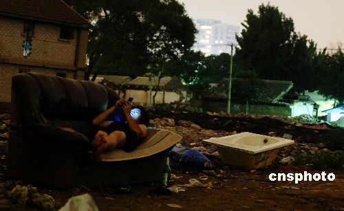 炎炎夏夜,在北京宣武区一片正在拆迁的四合院废墟里,一位青年正躺在废弃的沙发上用手机发短信,同时守护着其收购的成车废品。日前,北京市文物局曾下文要求予以原址保护的宣武区一处四合院建筑群被拆毁大部分。中新社发 廖攀 摄
