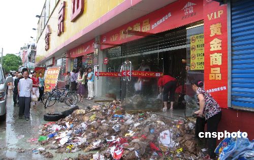 湖北京山县七月十三日普降特大暴雨,县城积水深度达到一米以上,部分地段超过两米。目前深积水已消退,京山购物广场的员工正清理被淹没的商品。中新社发 艾启平 摄