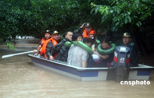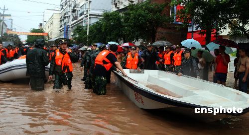 7月17日,重庆市遭受大范围持续暴雨袭击,该市沙坪坝区陈家桥镇近万名民众被洪水围困。驻渝部队和武警官兵调用十四艘冲锋舟赶赴现场救援。截至当日晚,水位还在上升,被淹处最深水位已达4米。中新社发 郭晋嘉 摄