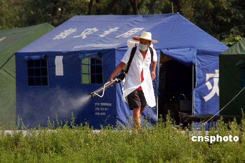 7月18日,利辛县疾病控制中心的工作人员正在灾区消毒防疫。安徽省利辛县境内的西肥河是淮河的一大之流,自淮河发生洪涝灾害以来,利辛县农作物受灾面积约971430亩,绝收面积约284490亩,受灾人口639850人。利辛县目前已安全转移群众35200人,这些群众全部得到妥善安置,基本生活得到了保障,卫生防疫部门正在灾区积极开展防病防疫工作,以确保在大灾之年无大疫。中新社发 张延林 摄