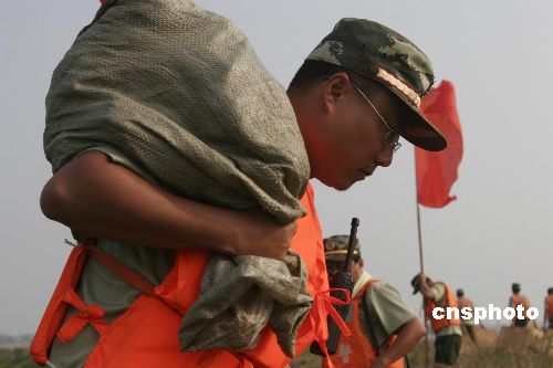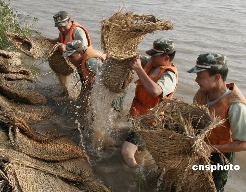7月18日晚至19日晨,淮河第三次洪峰通过安徽凤阳淮河临淮关及黄湾乡,河流湍急、风高浪险,使境内浸泡的淮河大堤出现多处渗漏、管涌、塌方,险情随时可见,情况十分危急。面对险情,连日奋战在大堤上的武警滁州支队800多名官兵发扬不怕苦不怕死的革命精神奉命固守淮河险段,激战洪峰;官兵们背土袋、堵渗漏、战塌方、加固堤坝、确保沿淮群众和数十万亩良田免遭洪水袭击。中新社发 汪 强 摄