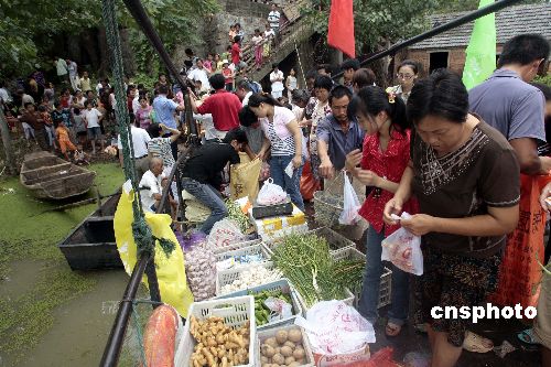 七月十九日,一条物资运输船停靠在被洪水围困的安徽霍邱县林淮港镇上姜台村,为被围困的村民送来蔬菜、食用油、猪肉以及日用品。由于政府提供了两、三成的补贴,还有价格部门的现场监督,这些物资比市场价格便宜不少,运输船俨然成为“流动市场”,不少村民前来购买。中新社发 盛佳鹏 摄