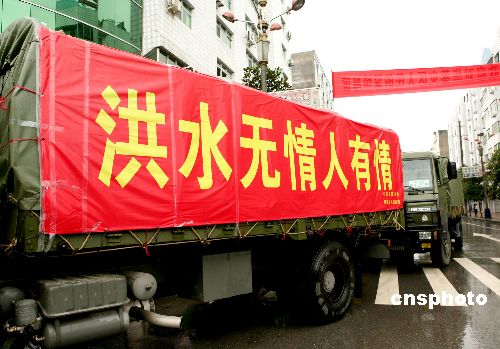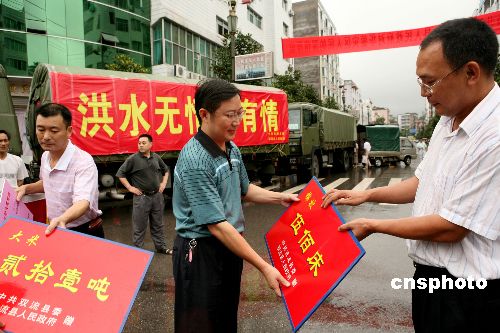 7月19日下午,四川省华蓥市的灾民在领取双流县专程送来的赈灾粮。当日,得知华蓥市被山洪袭击灾情十分严重的消息,双流县主动伸出援助之手,专程送来10万元现金、21吨大米、500床棉被。中新社发 邱海鹰 摄