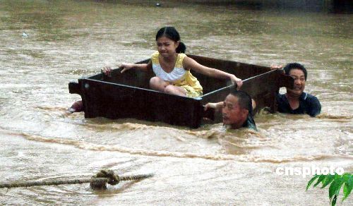 7月16日至18日,一位被洪水围困的小女孩被转移到安全地带。由于四川华蓥市连续几日普降暴雨,洪水泛滥成灾。该市出动武警消防官兵、机关干部、人民群众等近万人参与抗洪抢险行动,勇斗洪魔。中新社发 杨天军 摄
