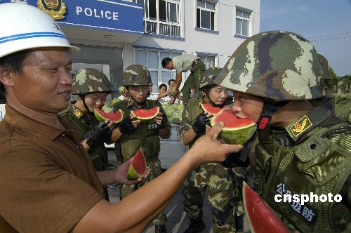 7月20日,瑞安市飞云江农场一瓜农将西瓜送给正在训练的边防官兵。“八一”建军节前夕,浙江省瑞安市飞云江农场三分场开展送清凉进警营活动,瓜农们将2000多斤的西瓜送到瑞安市飞云江边防派出所和特勤中队警营,表达对他们的深情厚意。中新社发 蔡宽元 摄