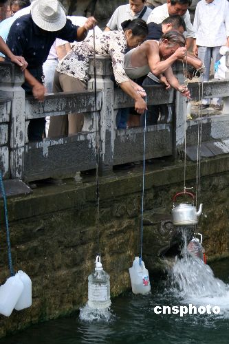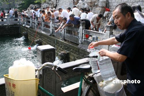 7月21日,济南黑虎泉西侧虎头的流量明显放大。一场暴雨过后,黑虎泉地下水位大幅攀升约,黑虎泉再现“黑虎啸天”壮观景象,引得众多爱泉人围观欣赏。泉洞旁和三个虎头聚集了不少打水者,不断地从泉洞和虎头内接水,三个虎头喷涌势头煞是喜人。中新社发 俄国庆 摄