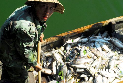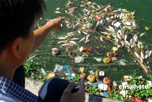 位于海南海口市城区的红城湖近日突然出现大批死鱼,打捞后送往郊区农场作肥料填埋。海口市环境保护监测站和海口环保监察支队到现场取水样检验,群鱼死因目前尚无结论。中新社发 善平 摄