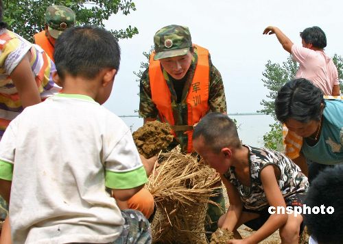 7月25日中午,淮河干堤明光阚双段迎水面发生塌坡,长达200米。一旦发生溃堤,16.6万土地、近6万人口的生命财产安全将受到严重威胁,南京军区某红军团300名官兵紧急赶赴现场,与当地群众一起固基护坡。中新社发 军中摄影师 摄