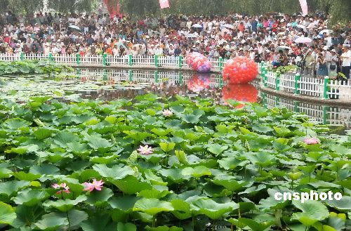 7月25日,第21届中国(大连)荷花展在辽宁大连劳动公园开幕,荷展为期一个月。当日,万余市民和游客前来观赏。中新社发 王锡增 摄