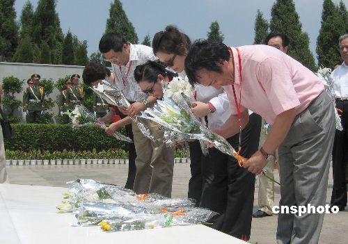7月25日,为纪念原中国国家主席杨尚昆诞辰一百周年,杨尚昆的故乡重庆潼南县举办了系列纪念活动。杨尚昆次子杨绍明携杨家亲属回乡祭扫位于潼南县双江镇的杨尚昆陵园。图为杨绍明(右一)和亲属祭拜杨尚昆。中新社发 郭虹 摄