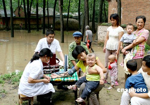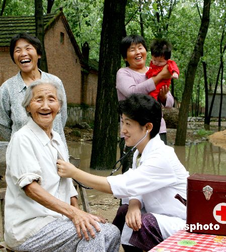 2007年7月25日,淮北供电公司职工医院的医务人员在淮北市烈山区古饶镇为村民体检。受持续降雨影响,安徽淮北部分地区内涝严重,为确保村民健康,淮北供电公司职工医院组织医务人员深入农村,开展水后健康知识宣传,为村民免费体验、送去医药。中新社发 王璋闻 摄