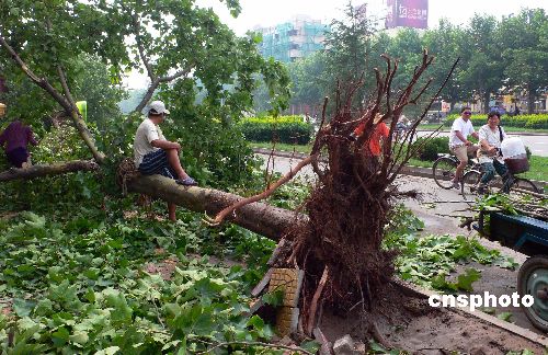 7月28日,河南开封市街头被大风刮倒的树木。27日下午5时许至晚10时30分,开封市遭遇今年入夏以来最大的一场强降雨,市区电闪雷鸣,狂风大作,暴雨倾盆,造成市区内严重积水,不少行道树、临街树木被刮倒。中新社发 凯枫 摄