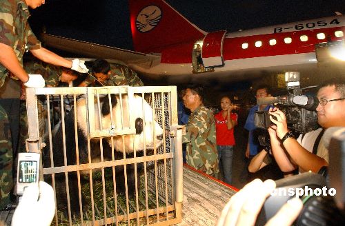 7月27日晚,大熊猫“龙腾”抵达沈阳。“龙腾”来自四川雅安碧峰峡大熊猫基地,将在沈阳冰川动物乐园“安家”12个月。中新社发 罗澜 摄