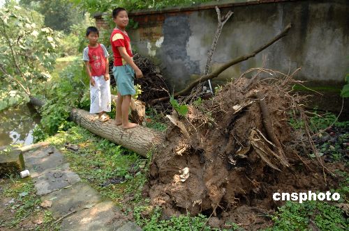 7月29日上午,两个孩子站在被狂风连根拔起的大树上玩耍。7月28日傍晚,安徽六安市裕安区韩摆渡、苏埠、石板冲等乡镇遭受罕见大风及冰雹袭击,很多大树被拦腰截断或连根拔起,上百间民房及农作物受损。据当地居民介绍,整个过程持续了半个小时左右。中新社发 马启兵 摄