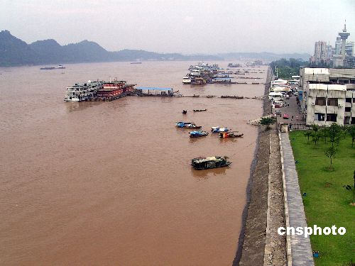 2007年7月30日,长江湖北宜昌城区江段水位突破53米警戒水位。当日下午,长江三峡入库流量52500立方米每秒,葛洲坝出库流量46776立方米每秒,葛洲坝下游湖北宜昌城区水位高达53.6米,突破53米的警戒水位。据悉,近几日长江上游及三峡库区持续降雨,三峡大坝为应对长江上游出现更大洪水持续泄洪,长江湖北江段水位全线上涨。中新社发 刘君凤 摄