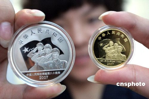 | 2007年7月31日,工作人员展示上市的“中国人民解放军建军80周年金银纪念币”。当日,中国人民解放军建军80周年金银纪念币在郑州上市。该套纪念币共2枚,其中包括1/2盎司圆形金质纪念币1枚,最大发行量10000枚;1盎司圆形银质纪念币1枚,最大发行量30000枚,均为中华人民共和国法定货币,纪念币正面图案均为中国人民解放军军旗与陆海空三军人物形象造型,并刊有国名、年号及“中国人民解放军建军八十周年”中文字样。 中新社发 陈代述 摄