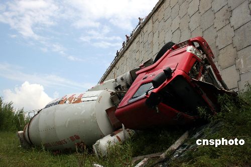 7月30日凌晨,黑龙江哈尔滨松北区宾州桥发生一起坠桥事故,一辆水泥罐车撞断15米长的护栏坠入10余米深的宾州桥下,驾驶室严重变形,司机奇迹生只受轻伤。据交警部门披露:这起事故是7月29日晚11时30分发生的。中新社发 肖劲彪 摄