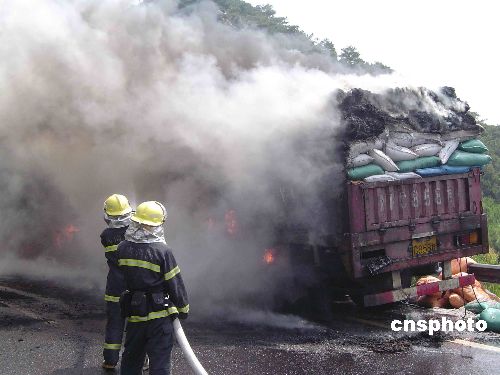 7月31日上午10时许,福泉高速路福州往泉州方向一辆满载泡沫塑料的货车发生自燃,福清消防官兵经过三小时奋战扑灭大火,所幸事故未造成人员伤亡。中新社发 朱晓航 摄
