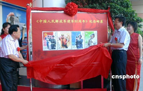 8月1日,海南在海口举行中国人民解放军建军暨琼崖纵队成立80周年邮资票品发行仪式。当日,海南省邮政公司设置革命题材邮品的展销柜台,吸引了众多集邮迷。据悉,8月1日和9月23日,分别是中国人民解放军建军80周年纪念日和琼崖纵队成立80周年纪念日。中新社发 善平 摄