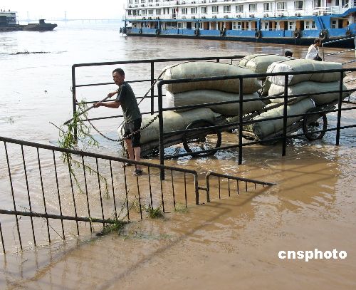图为湖北宜昌港客运码头进行清漂。8月1日,长江上游1号洪水以每秒44300立方米的流量,裹挟着大量的漂浮物,经过长江中上游分界线200米的湖北宜昌港5码头。超过52米设防水位0.15米的洪峰使三峡船闸停航,4000多名旅客进行翻坝运输。中新社发 韩玉洪 摄