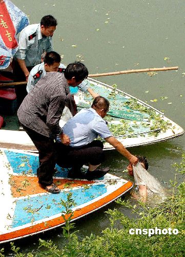八月一日,福州西湖旁,一偷窃电动车的窃贼被人发现后于恐慌之中跳入湖里,不过还是被随后赶到的鼓西派出所民警从湖里当场抓获。中新社发 王东明 摄