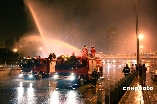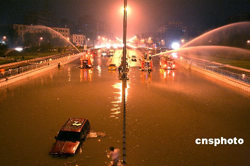 八月二日凌晨,消防车为北京北三环安华桥紧急抽排大量积水。八月一日夜里,北京北部出现了局部特大暴雨,其中安华桥积水最深时达两米。这段北京最繁忙的道路之一的路段一度交通中断。中新社发 廖攀 摄