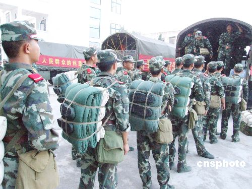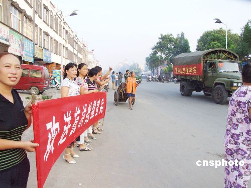 | 8月2日,驻安徽霍邱参加淮河大堤抗洪抢险的武警安徽省总队直属支队和六安支队的官兵,相继登车启程返回军营。背景资料:2007年7月初以来,淮河流域发生仅次于1954年的全流域性大洪水,霍邱境内79公里淮河大堤告急,武警安徽省总队直属支队和六安支队的600余名官兵奔赴淮河抗洪抢险第一线,与当地群众一起抗洪,取得了守护淮河大堤的全面胜利。目前,淮河水位已回落警戒线水位以下,抗洪勇士们奉命返营。中新社发 晓远 摄