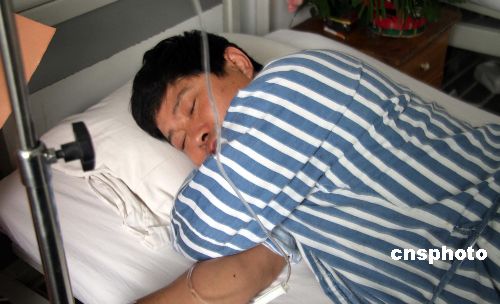 八月二日,记者在三门峡市中心医院二0八病房十五床见到了第一个被营救出来的矿工兰建宁,略显疲惫的他表示,目前身体状况还好。中新社发 刘文辉 摄