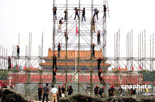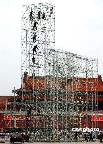 8月2日,工程人员正在紧锣密鼓的装点北京天安门广场,为8月8日晚8时8分在这里举办的北京奥运会倒计时一周年庆祝活动布置场地。据悉,届时国际奥委会将在这里向世界205个国家和地区的奥委会发送参加北京奥运会的邀请函,这是国际奥委会首次将这一重要仪式定在奥运主办城市进行。同时中国各地许多城市也将举办欢庆活动。中新社发 宋吉河 摄