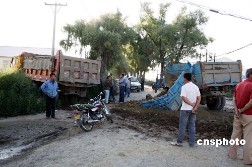8月3日清晨4时许,黑龙江哈尔滨松北区哈呼公路发生一起交通事故,一辆卡玛撕翻斗车与一辆金刚解放货车相撞,卡玛撕翻斗车撞坏路边农家的铁栅栏,车前部冲入农家院,金刚车驾驶室严重扭曲变形,零件洒落一地。事故中金刚货车驾驶员受轻伤。据交警介绍,事故因刹车失灵所致。中新社发 肖劲彪 摄