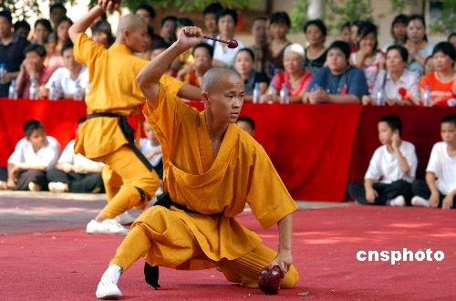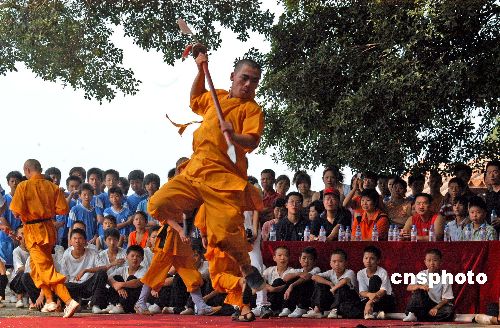 八月四日上午,侨乡泉州少林寺举行了隆重的观音阁奠基仪式,该寺武僧为来宾表演精彩功夫。观音阁是泉州少林寺的复建主体项目之一,将按闽南传统古建筑风格与现代钢筋水泥结构整合建造,建成后占地一千一百平方米、高二十二米,将供奉采用非洲菠萝格红木材料雕塑、高十二米的福建最高站莲观音塑像。中新社发 傅丹丹 摄