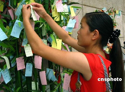 8月5日,距离农历七夕节(8月19日)还有两周,一名在北京居住的女青年将“七夕节”祝愿张挂在华堂商场“七夕鹊桥”的许愿树上,企愿家人幸福平安。中新社发 邹宪 摄