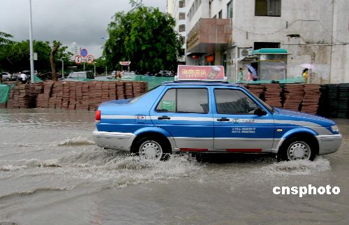 八月六日,受今年第六号热带风暴影响,海南全岛出现中到大雨、局部暴雨的强降水天气。强降水造成城市部分街道出现积水,给市民出行造成不便。图为三亚市出租车在雨后积水的街道上缓慢前行。中新社发 尹海明 摄