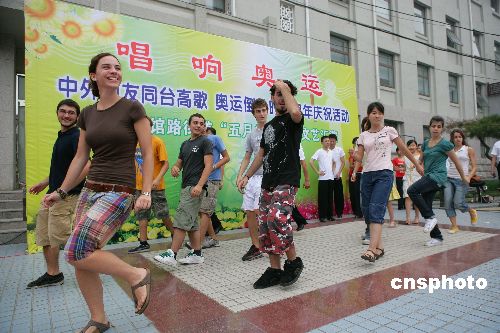 8月6日,北京崇文区体育馆路街道在社区举行了“唱响奥运——中外朋友同台高歌迎奥运”联欢活动,迎接奥运倒计时一周年,500多名社区群众和意大利、法国朋友一同高歌,唱响对奥运期盼之情。中国奥委会副主席吴寿章、国家体育总局群体司副司长杨卫等和社区居民一起参加了活动。中新社发 文白 摄
