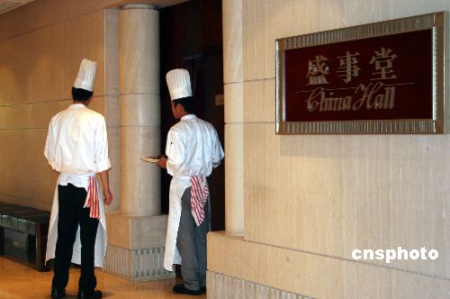 八月六日,“小巨人”姚明在上海举行神秘婚礼,申城坊间再度掀起一股“姚明热”。图为姚明在上海黄浦江畔的香格里拉大酒店盛事堂的婚宴现场。婚宴启用多位“标志”帅哥传菜,菜肴“中西合璧”。中新社发 许晓青 摄