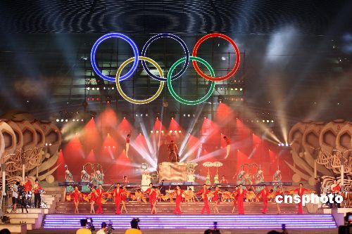 8月6日,北京奥运会协办城市之一的天津,以一场别开生面的大型文体表演,拉开了社会各界庆祝奥运会倒计时一周年活动序幕。中新社发 赵瑜 摄
