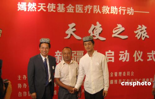 | 8月7日,嫣然天使基金创建人李亚鹏在新疆乌鲁木齐正式启动“天使之旅”医疗救助行动。“嫣然天使基金”由李亚鹏、王菲夫妇于2006年11月21日发起成立,是设立在中国红十字基金会的专项公益基金,主要资助家庭贫困、身患唇腭裂的14周岁以下儿童。目前,该基金会共筹得募款1400余万元,截至7月31日总共救助了170名唇腭裂患儿。图为首批救助者亚尔的父亲和李亚鹏及中国红十字基金会秘书长王汝鹏合影。中新社发 缑烨 摄