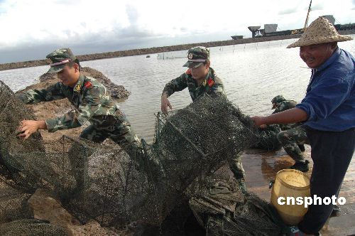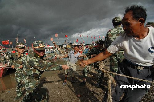 | 8月7日,边防官兵在浙江省台州市前所镇涛江闸帮助渔民固定渔船。当日,浙江省台州市渔政、边防、海事等部门及时做好台风来临前的宣传工作,通知出海船只回港避风,并要求辖区渔排养殖、危房群众及时做好转移准备。据气象部门预计“帕布”将于8日上午在台湾中南部沿海登陆,并穿过台湾海峡,于8日傍晚到夜里在福建中南部沿海登陆。8日上午起,浙中南沿海海面将出现9-11级偏东风,浙北沿海海面8日下午起有7-9级偏东大风。8日下午起浙东和浙中南地区有中到大雨,其中温州、丽水和台州有大到暴雨、局部大暴雨。中新社发 朱孝钦 摄