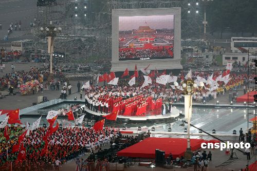2007年8月8日晚,“北京奥运会倒计时一周年庆祝活动”在天安门广场举行,国际奥委会主席罗格向世界各国、各地区奥委会的代表发出邀请函。 国际奥委会首次选择在主办城市举行这项仪式表明,北京奥运会的筹办工作被国际奥委会充分肯定。中新社发 毛建军 摄