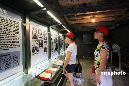 八月十日,在七月的暴雨洪灾中严重受损的重庆红色旅游景点——重庆市渣滓洞景区重新开放。目前,游客不仅可以参观文物还原的男牢展室,还可以目睹渣滓洞现场文物维修以及修复中的女牢、刑讯室和渣滓洞整体结构。图为两名游客正在参观男牢展室。中新社发 杨明荣 摄