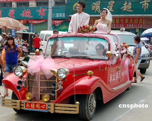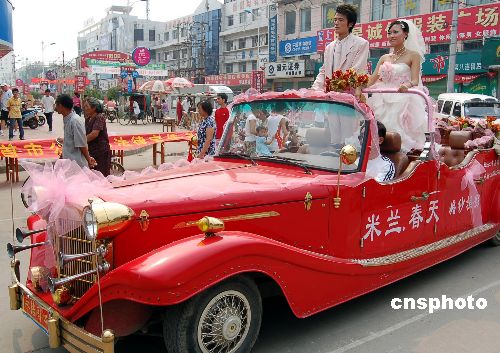 8月13日上午,安徽省界首市一婚庆公司的一对“新婚”模特站在一辆改装的老爷车上巡游大街,吸引了众多群众驻足观看。随着中国“情人节”——“七夕”临近,界首市婚庆市场又进入旺季,各大中小婚庆商家纷纷推出别出心裁的促销活动,预热“七夕”婚庆商战。中新社发 王彪 摄