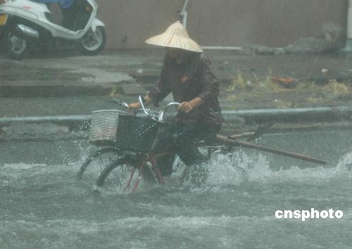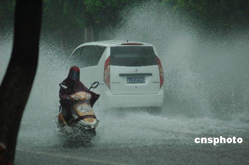 8月14日上午,一场暴雨不期而至降落在浙江台州市区。3个多小时的暴雨使市区道路积水成河,给市民出行带来不便。中新社发 郏策 摄