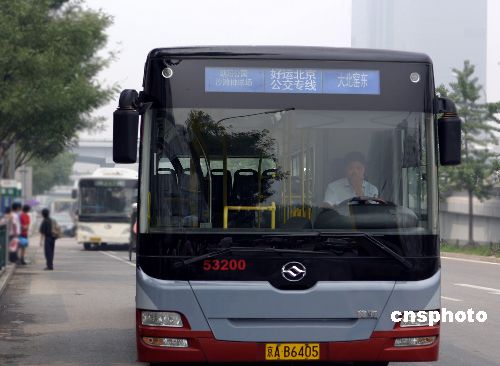 8月16日,一辆“好运北京”公交车从北京东部的大北窑发车。8月13日,北京公交集团公司开通第四条“好运北京公交专线”,由大北窑东开往朝阳公园沙滩排球场,单程8.5公里,提供市民前往朝阳公园沙滩排球场观看2008北京奥运测试赛“2007年世界排联女子沙滩排球挑战赛”。该体育赛事工作人员和志愿者可凭“好运北京”组委会颁发的身份注册卡在有效期内免费乘坐,观众乘车为单一票制一元,持IC卡乘客可享受成人4折、学生2折优惠。中新社发 王璇 摄