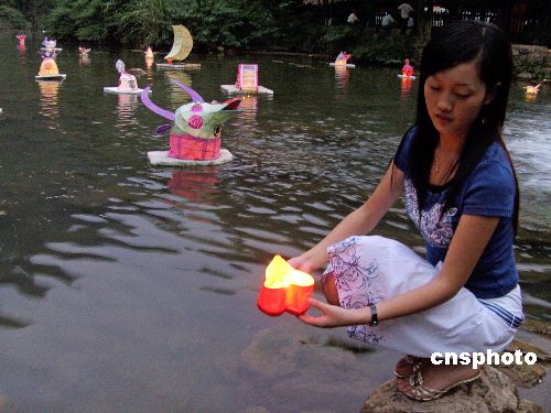 8月18日夜,湖北宜昌三峡车溪民俗旅游区举办了“七夕中国情人节”放花灯活动,近百名青年男女亲手放逐河灯或放飞孔明灯来许下心愿,欢度“七夕”节。 中新社发 刘君凤 摄